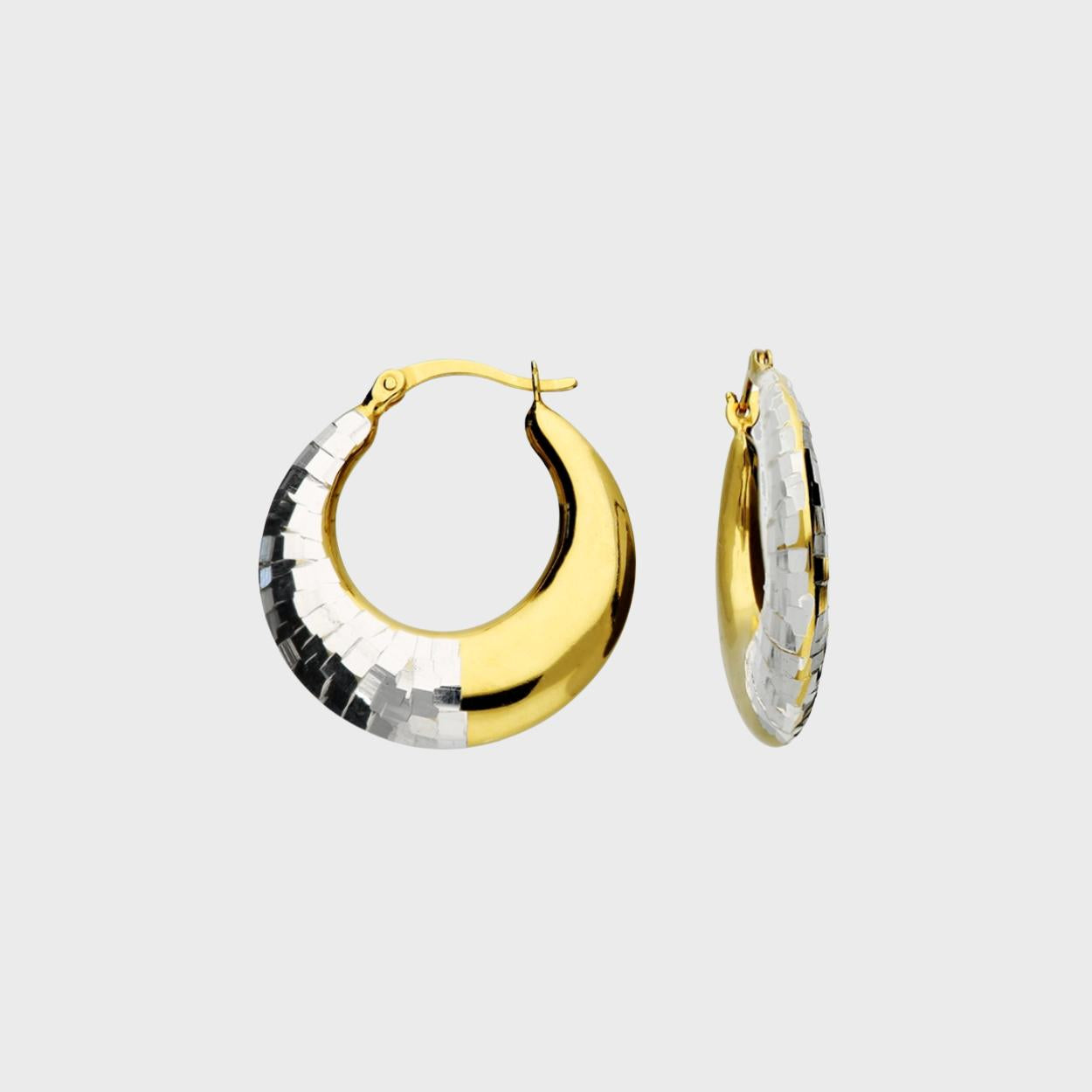 Crafted from sterling silver with an 18ct yellow gold plate, these earrings feature a unique, asymmetric design—one half highly polished, the other faceted to resemble a disco ball.