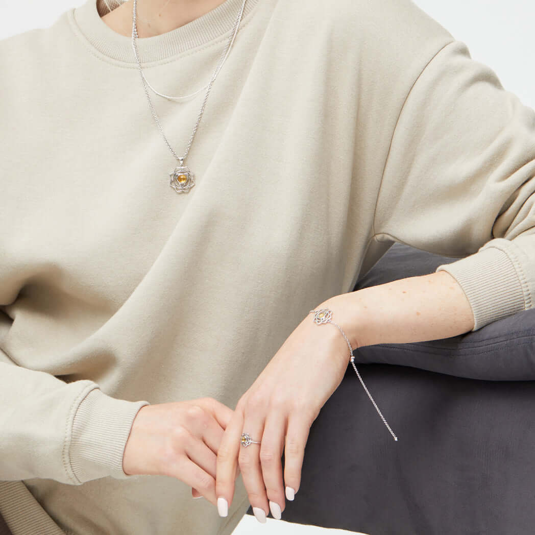 The FIYAH Solar Plexus Chakra Ring is made from sterling silver and finished with a silver plating for extra sparkle. The centre stone is a natural citrine gemstone used to help amplify and activate your solar plexus chakra. This silver solar plexus chakra ring is adjustable in size, allowing you to easily adjust the ring to your size for any finger.
