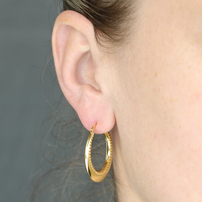These Beaded Creole Hoop Earrings are crafted from sterling silver and 18ct gold plate, providing a subtle shimmer and luxurious feel. The classic hoop design is given an update with intricate inner beading details, making these earrings a statement piece. Perfect for any occasion.