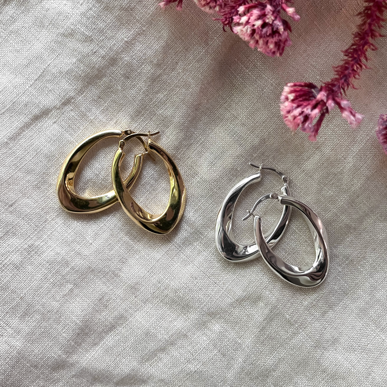Luna Oval Hoop Earrings offer a modern twist on a timeless classic. Elegantly contoured with a soft oval silhouette, these hinged hoops are crafted in sterling silver and finished with the option of 18ct gold plate. Their sleek, sculpted form brings effortless sophistication to any look—perfect for everyday wear or elevated occasions.