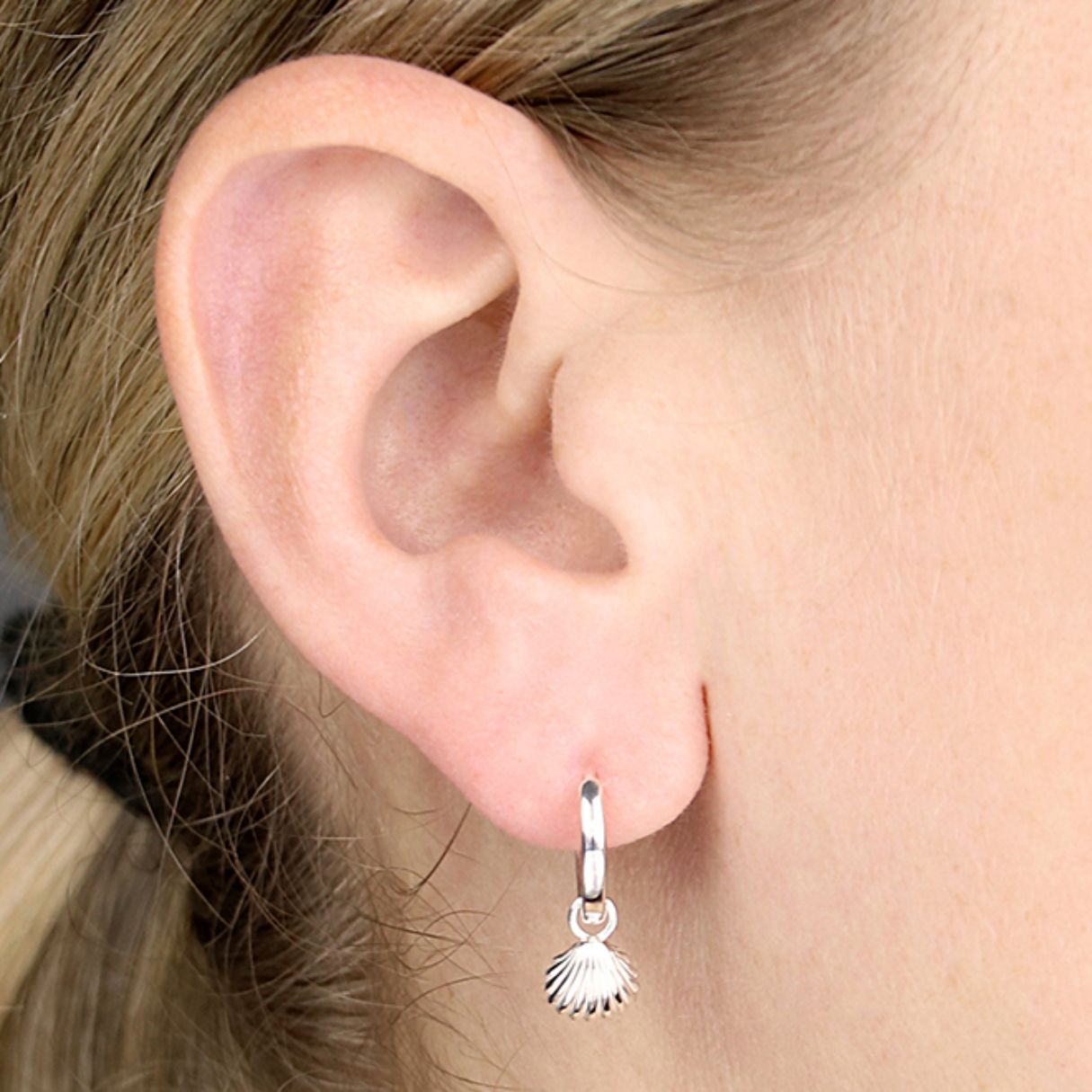 The Shell Huggie Earrings are shaped and cast in sterling silver with a rhodium plate or an option of 18ct gold plate.