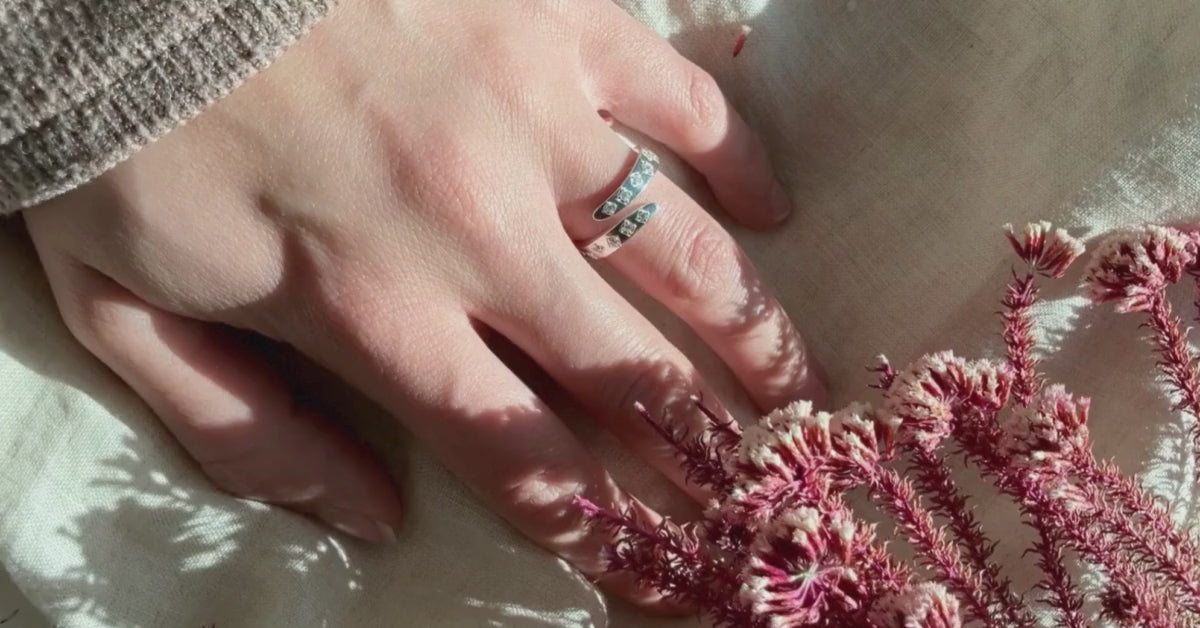 The Adjustable Balance Ring is a simple, elegant piece crafted from sterling silver, with the option of 18ct gold plating. Its adjustable design gently wraps around your finger, giving you a perfect, comfortable fit. Tiny square motifs are delicately arranged, catching the light with subtle sparkle.