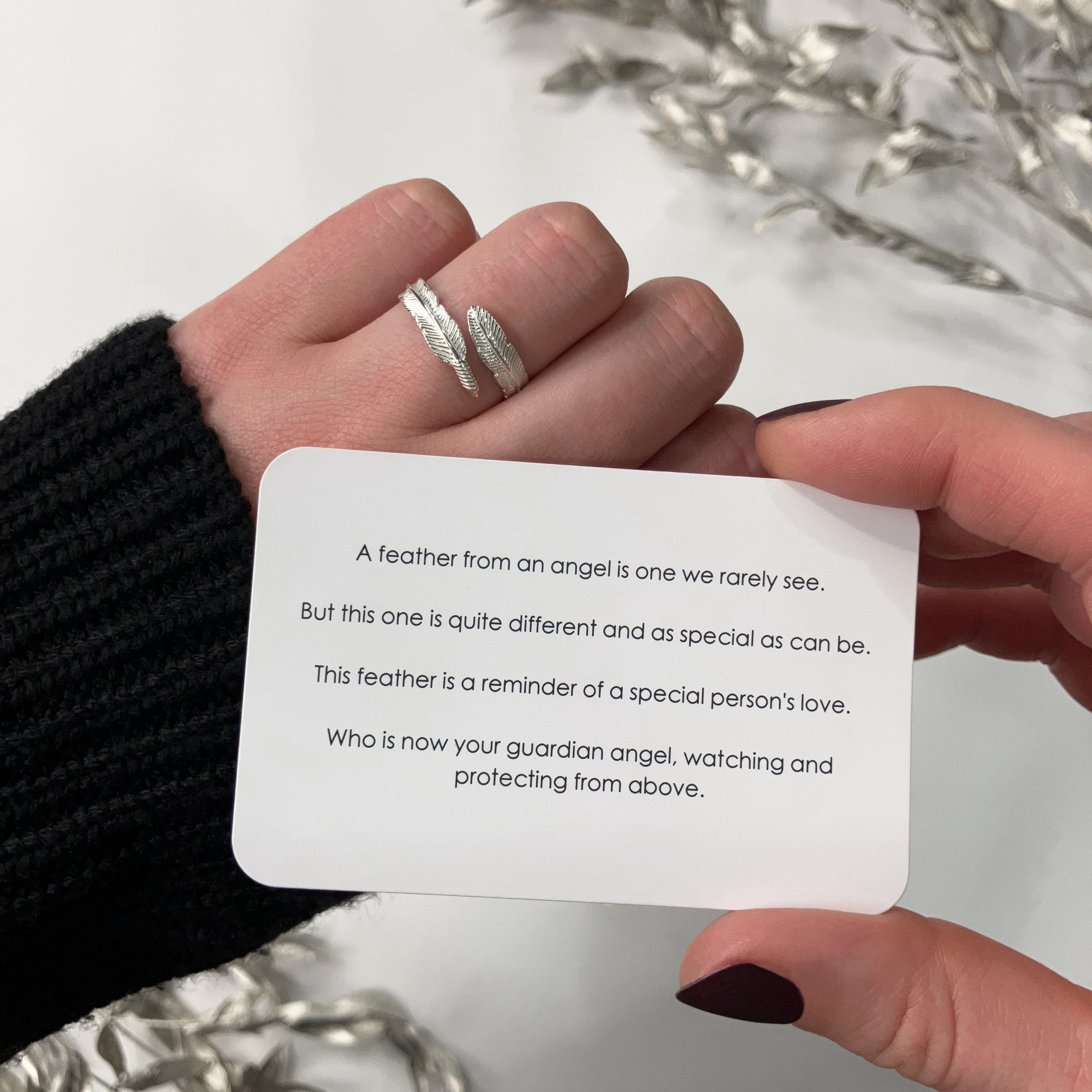 Paired with the Plume Ring, the poem becomes a gentle reminder that we are never truly alone – love lives on, carried by the wings of our guardian angels.