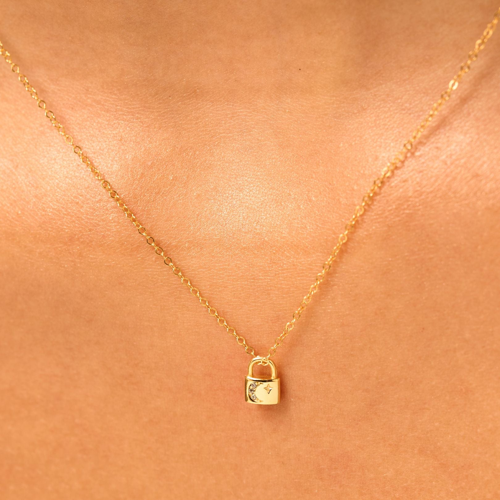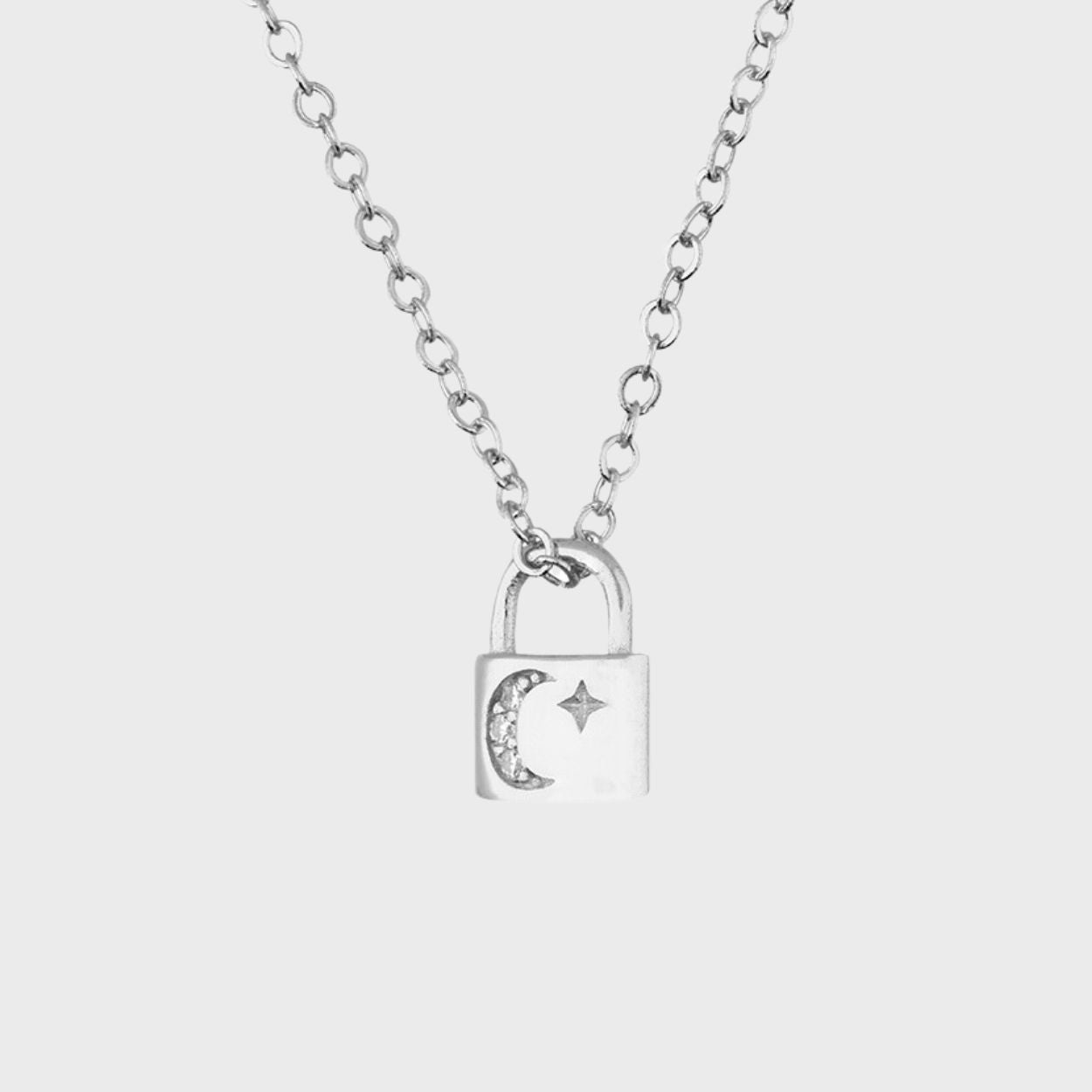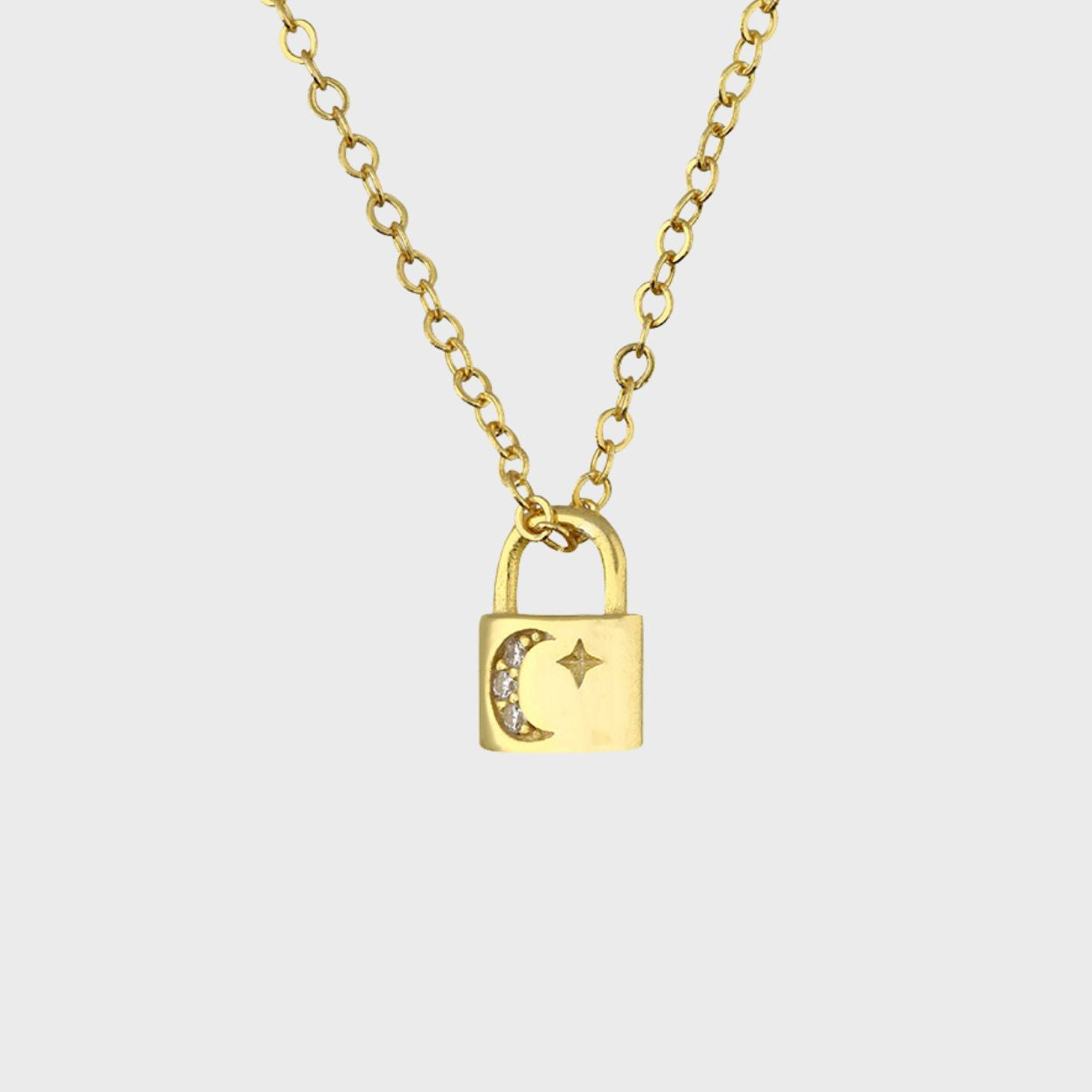 Unlock your inner sparkle with this exquisite Moon and Star Padlock Necklace! Made from sterling silver and 14ct gold plate, this elegant piece of jewellery is sure to make a statement. Perfect for any occasion, shine bright with this beautiful necklace.