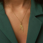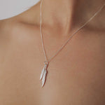 The Dual Plume Necklace is available in sterling silver, gold-coated sterling silver, or rose gold coated sterling silver combining effortless elegance with meaning.