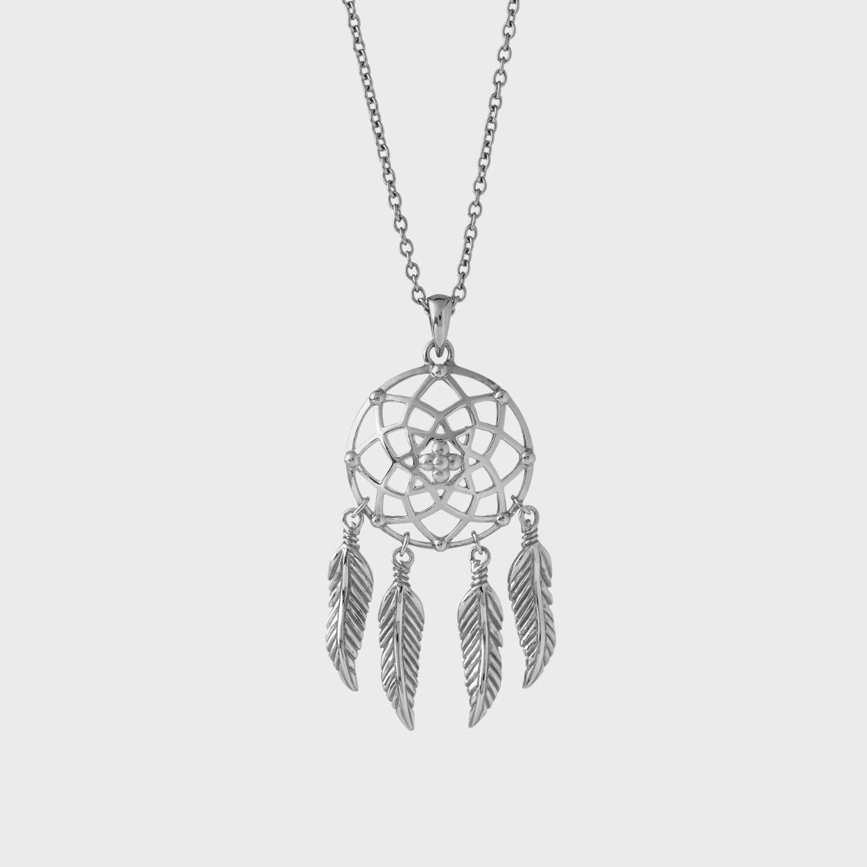 The Lakota Dreamcatcher Necklace is cast in Sterling Silver and coated in Rhodium for a brilliant finish and extra protection against tarnishing.